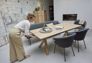 Bild 1: Dank flexibler Untergestelle und Verlängerungsfunktionen sind die Tische optimal individualisierbar und können auf die Situation im Esszimmer angepasst werden. Foto: IPM/Wimmer Massivholzmöbel